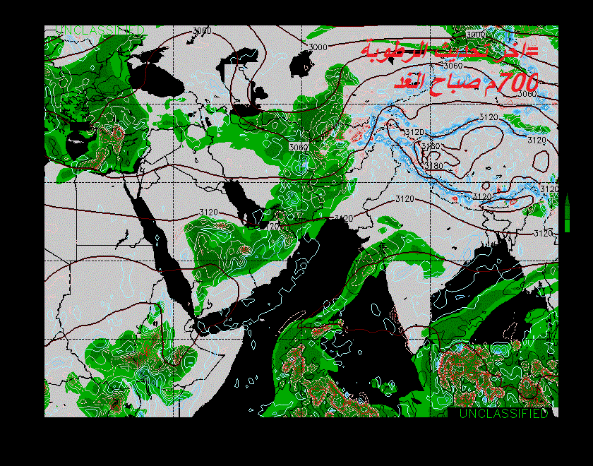 تشير النماذج العددية الى تأثر جنوب شرق شبه الجزيرة العربية بأخدود منخفض جوي يؤدي الى حالة من عدم الاستقرار في طبقات الجو العليا..