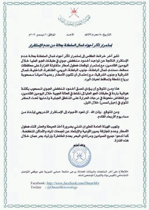 ملاحظ :: احتمال استمرار التوقعات على شمال السلطنة الى يوم الجمعة القادم 7 ديسمبر 2012م