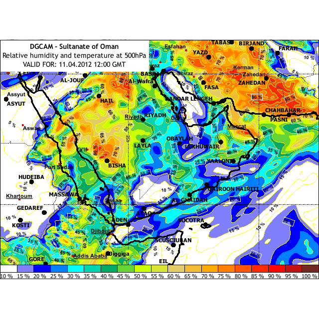 الرطوبة لطبقة 500 يوم الأربعاء الماضي من المودل العماني (الشكل الجديد) وواضح الرطوبة التي نتج عنه الأمطار على صور والحجر الشرقي