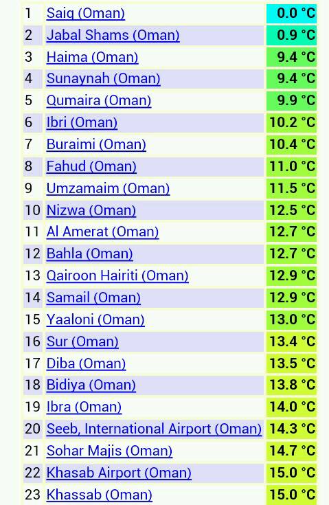 درجات الحرارة الصغرى المسجلة صباح اليوم بالسلطنة