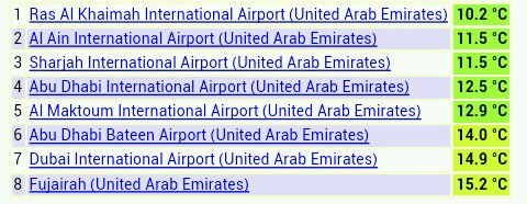 درجات الحرارة الصغرى المسجلة صباح اليوم بالإمارات