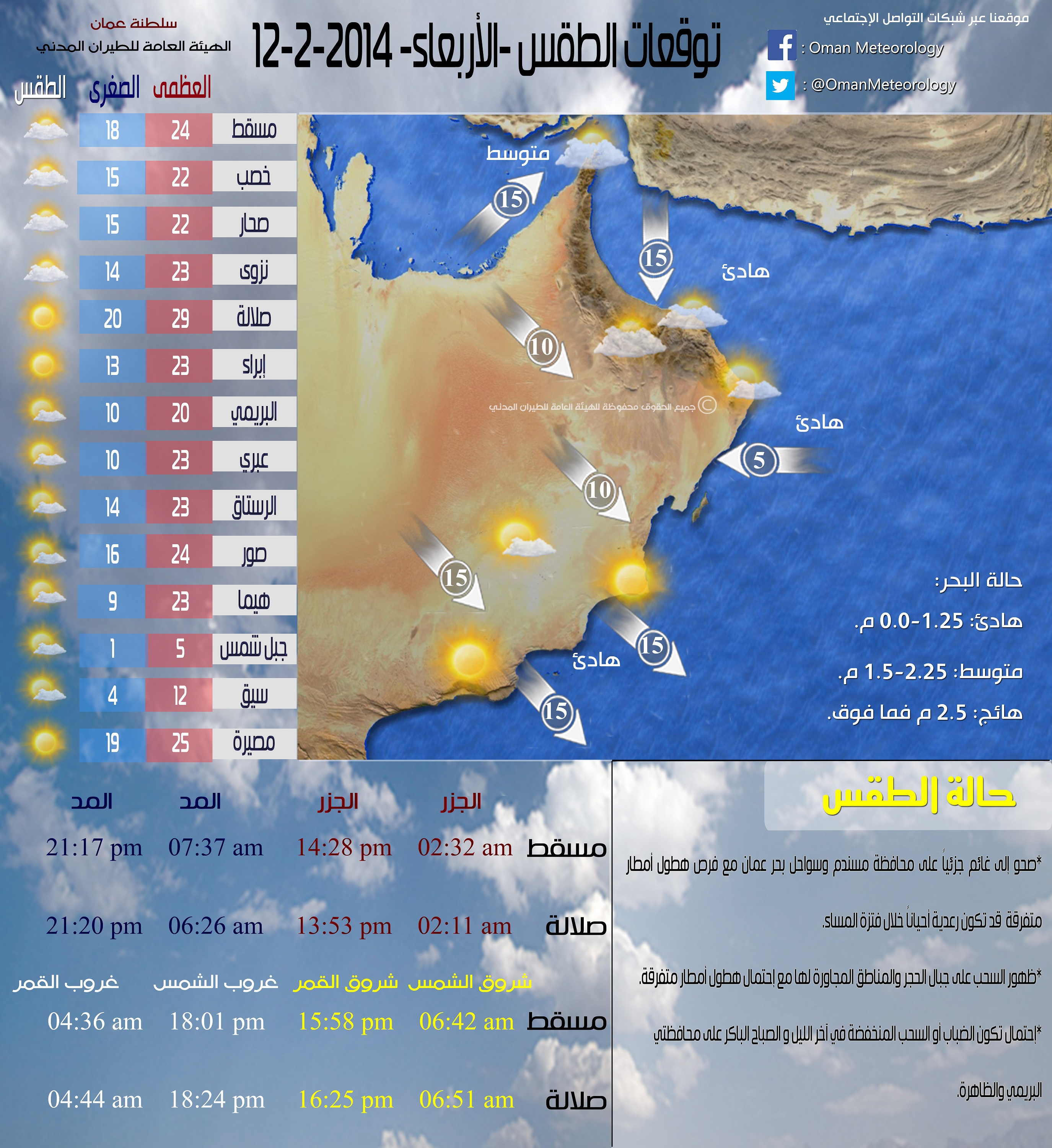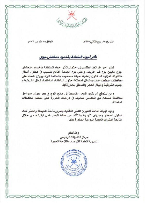 السلام عليكم . صبحكم الله بالخير والسرور .آخر مستجدات الحاله القادمه إن شاء الله تعالى من المحتمل ان تتأثر محافظة مسقط ومحافظتي الشرقيه وبعض الاجزاء من محافظة الداخليه ومحافظة جنوب الباطنه بحاله جويه جيده يوم الخميس القادم. ١٣ فبراير .