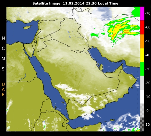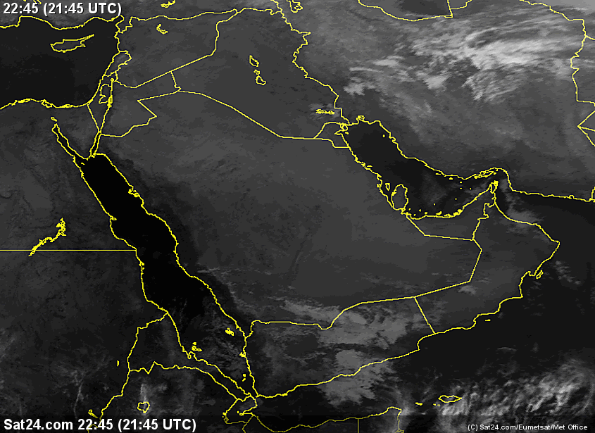 إنتشار متفرق لسحب على جبال الحجر الشرقي والسواحل الجنوبية ومسندم وبحر عمان والإمارات والخليج العربي