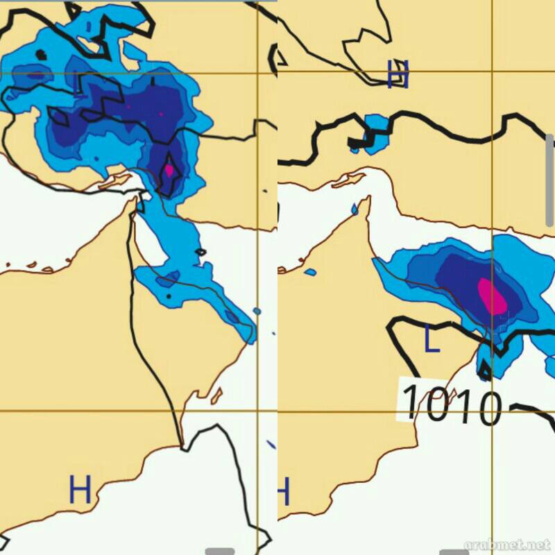هناك ايضا مؤشر وإحتماليه بنسبه أقل لتأثر جبال الحجر الغربي وسواحل شمال الباطنه ومحافظة مسندم ونتمنى ان تتحسن الاوضاع اكثر لليومين القادمين.والله أعلم