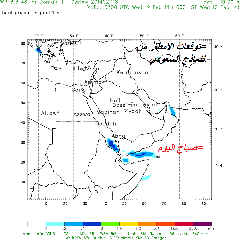 توقعات الامطار حسب التحديثات الاخيره من متوسطه إلى غزيره مع إحتمال نزول الاوديه وقد يصاحب الحاله نشاط رعدي ونزول لحبات البرد.الحيطه والحذر واجب في مثل هذه الحالات.
