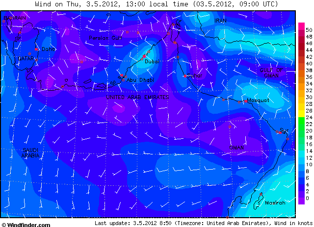 الرياح الساعة 1 ظهرا .. شمالية غربية الى غربية بعموم السلطنة ..