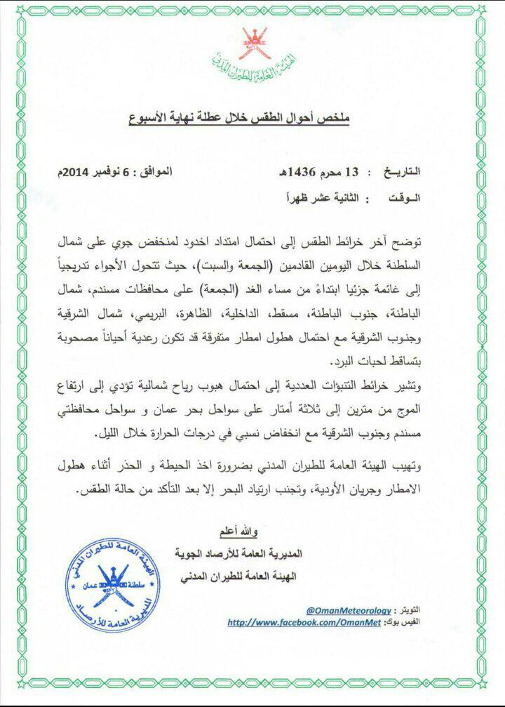 الى احتمالية هيجان الموج في بحرعمان اثناء هطول الامطار مع توقعات بجريان الاودية بالتالي ننوه الى اخذر الحيطة و الحذر و عدم المجازفة ,,