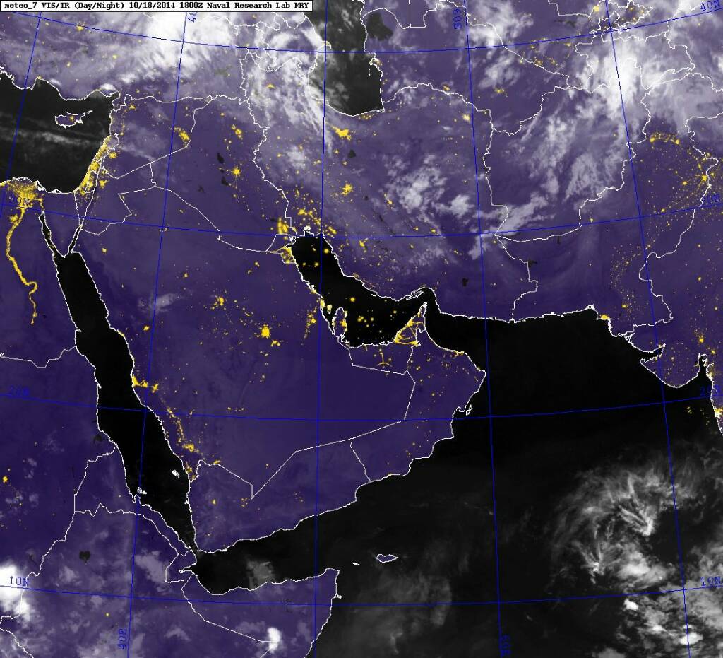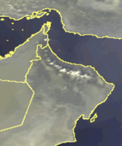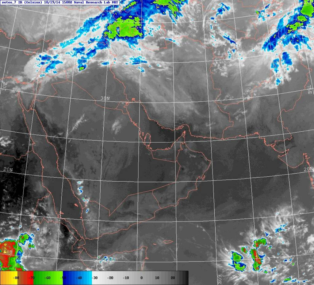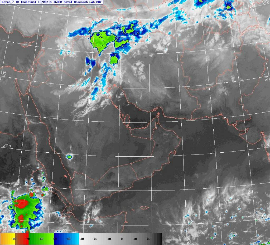 الأقمار توضح خلايا ماطرة بالمرتفعات على الحدود اليمنية السعودية وخلية أخرى على الأرضي الإيرانية بمقربة من الخليج العربي