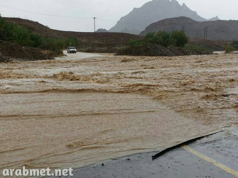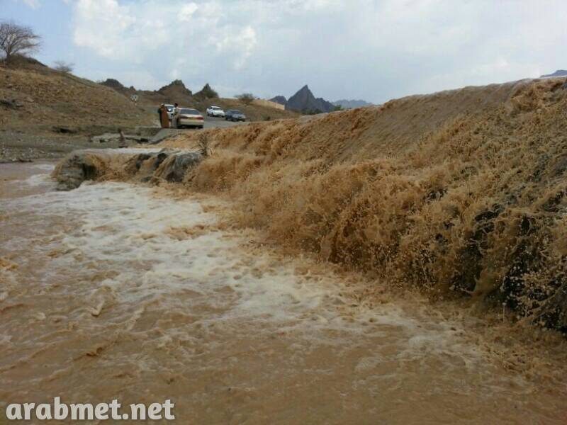 وادي السحتن يصل لمركز المدينة ويعبر الطريق المزدوج قرب منطقة الوشيل بجريان خفيف