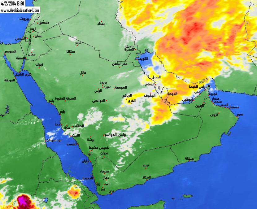 من خلال المتابعة وصور الأقمار راح تبدء السحب بالتأثير على الإمارات خلال الساعات القادمة وتوقعات بأمطار غزيرة مع برد إن شاء الله