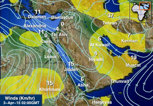الغبار راح ينزل على اليمن مع الشمالية الغربية ويبدأ بالصعود من بحر العرب مع الجنوبية الغربية وبهذا راح يشكل مثل الاترف على شكل موجة حيث من المتوقع تدني مستوى الروئية الأفقية إلى ما دون 1000 متر على الوسطى والشرقية وظفار. نتابع