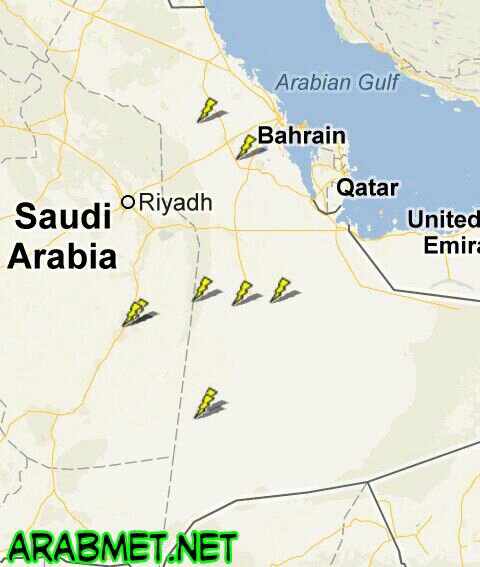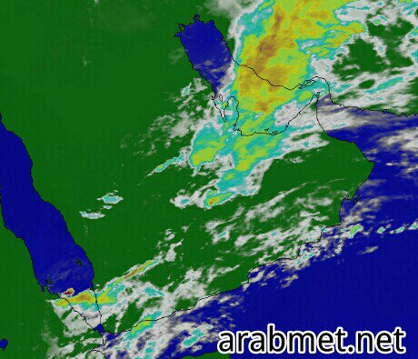 صورة الأقمار تشير إلى انتشار السحب الركامية والمتوسطة والعالية في أجزاء من الخليج العربي ، مع خلايا رعدة متفرقة ، تتأثر أجزاء من الإمارات ومسندم بأمطار خفيفة إلى متوسطة .