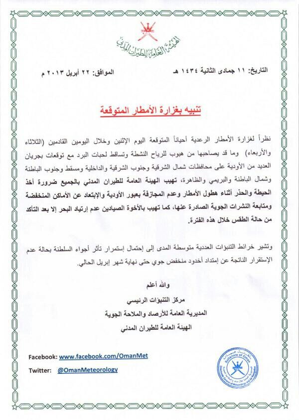 رد: متابعة حالة عدم الاستقرار على السلطنة ودول الخليج العربي ليوم الاثنين 22 ابريل 2013 والايام القادمة (ج2) ...