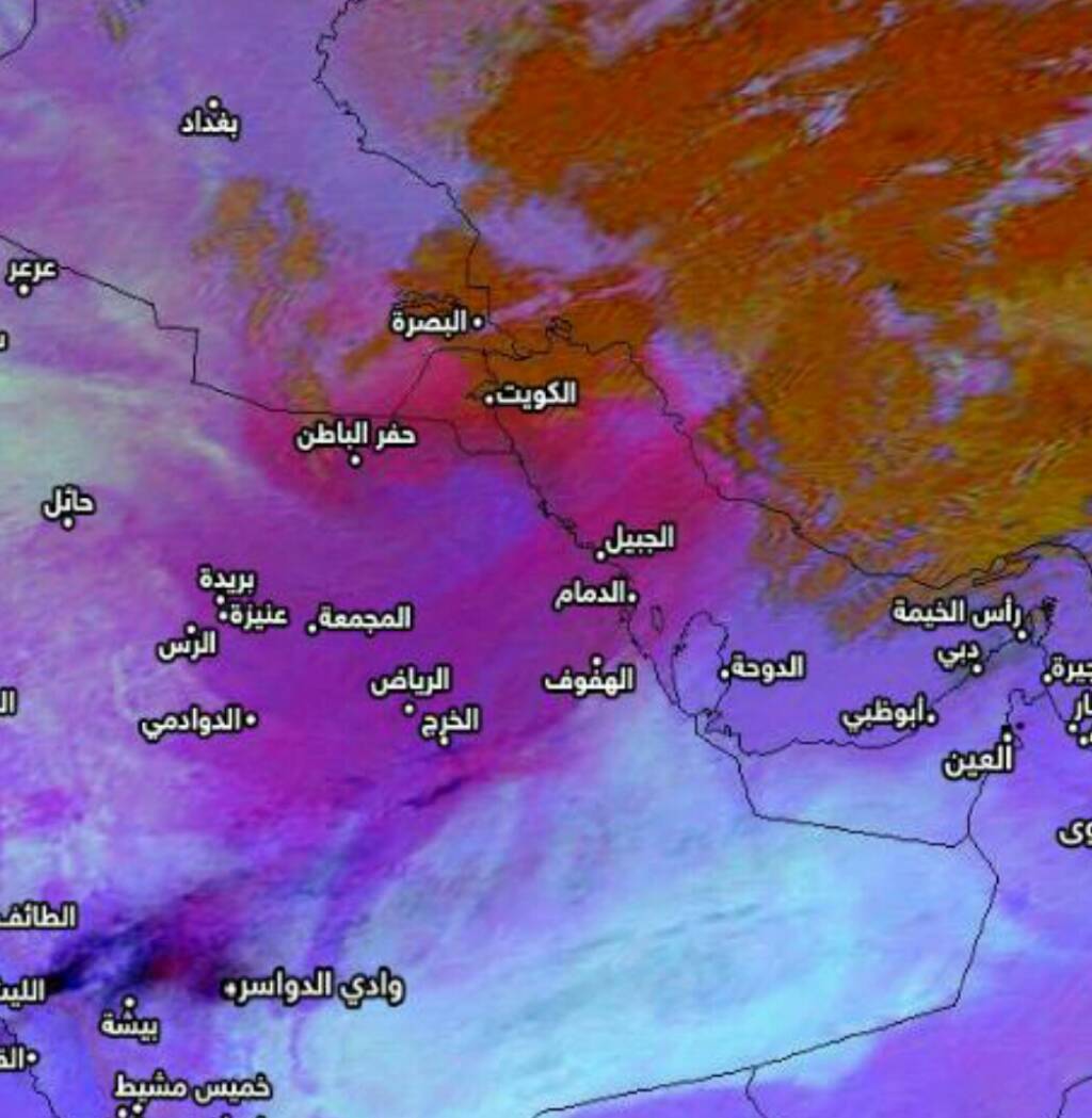 تشكل ثلاث كتل #غبار كثيفه شمال #السعودية ومتوقع اندماجها و انحدارها نواحي #القصيم و #الرياض و #الشرقية. #طقس