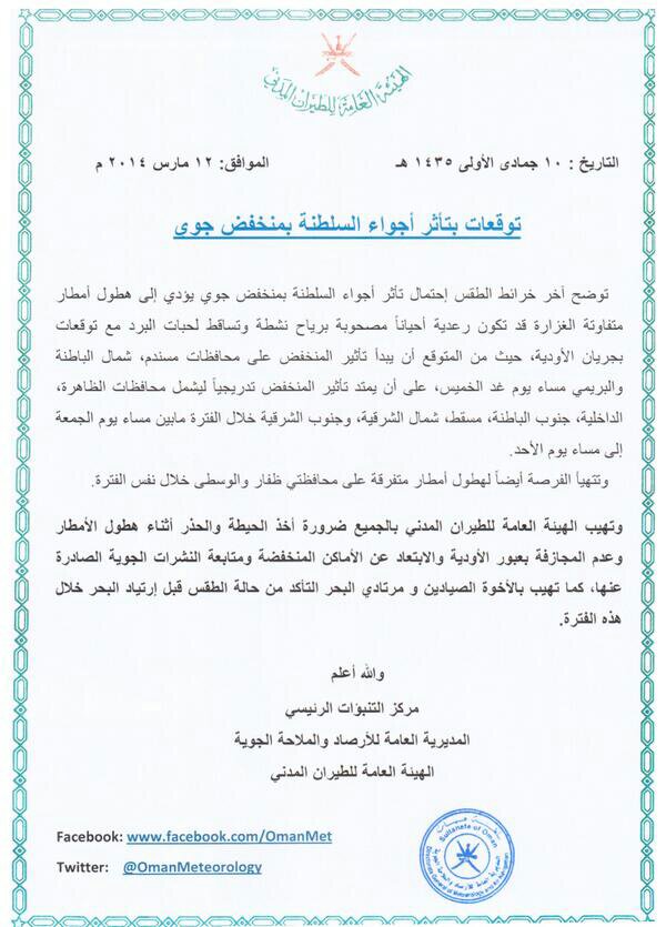 تشير آخر خرائط الطقس ونماذج التنبؤات العددية إلى إمتداد اخدود متعمق إلى اجواء السلطنة بدءا من الغد الخميس 13-مارس حتى يوم الأثنين القادم 17-مارس ... حيث يصحب بإمتداد رطب من القرن الافريقي وبحر العرب، وجود غلق جوي يبطئ من حركة الأخدود،معامل k-index مبشر وايضا مؤشر cape للعواصف الرعدية، فارق حراري ممتاز بين السطح وطبقات الجو العليا، وجود نقاط إلتقاء للرياح السطحية على صحراء الربع الخالي مما يعطي نشاط اقوى للتيارات الصاعدة...