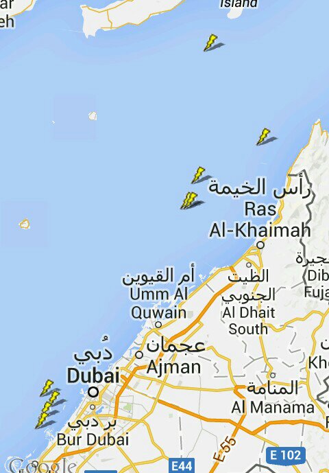 البروق الأن بالقرب من سواحل دبي ورأس الخيمة وغرب مسندم