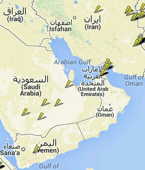 البروق بشكل عام على كل من اليمن والسعودية والخليج العربي وإيران