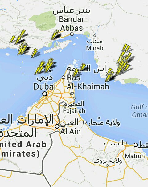 نشاط رعدي واضح حسب الرصد على أجزاء من الخليج العربي وإيران ومسندم