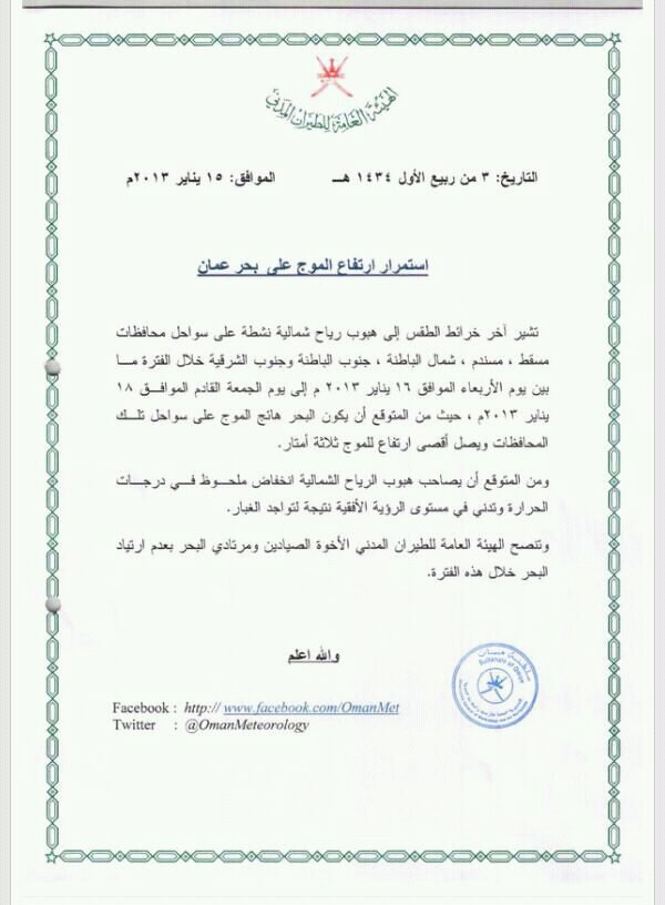 رد: متابعة: احتمال تأثر شمال السلطنة والخليج العربي والشام بمنخفض جوي 6 - 15 / 1 / 2013م