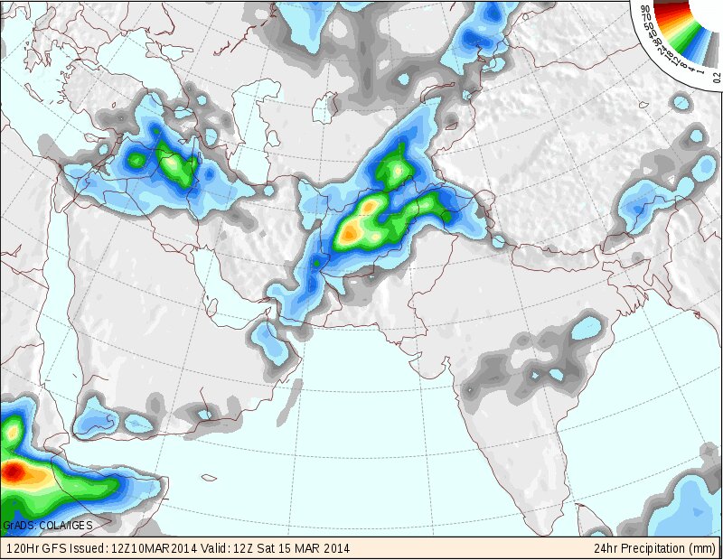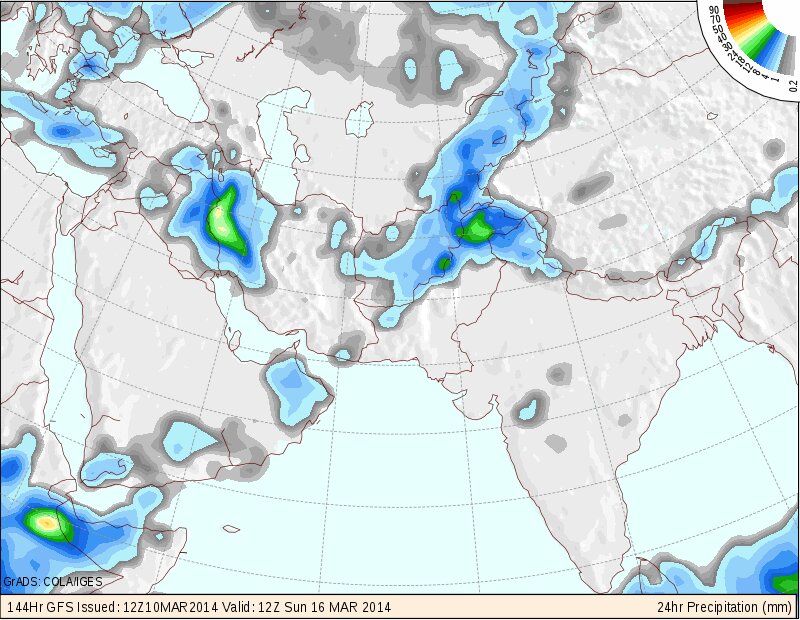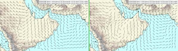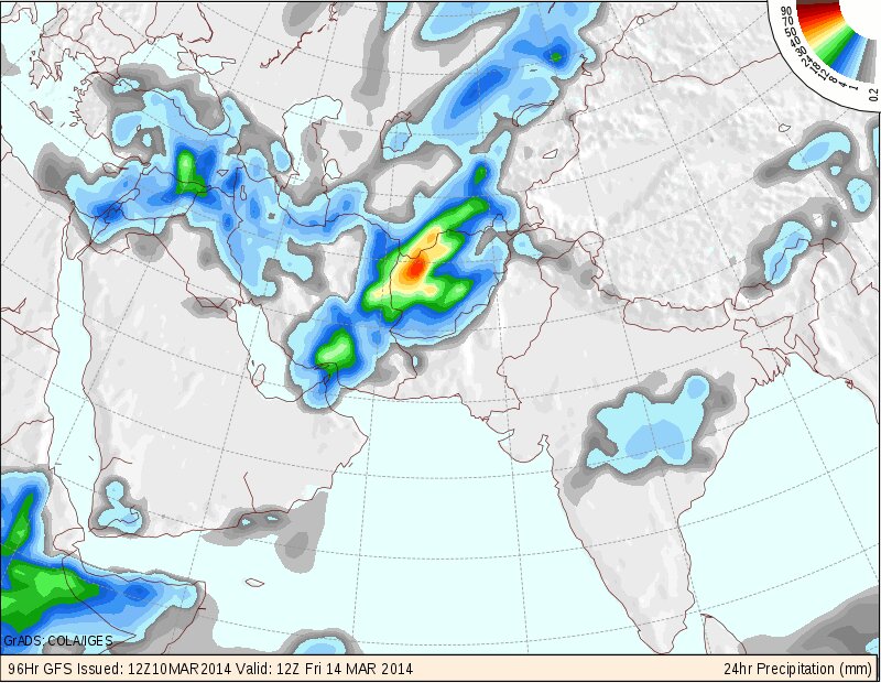 مؤشر فرص امطار على جبال الحجر والمناطق المجاورة ليوم غد 11/3/2014 لها حسب النموذج العماني