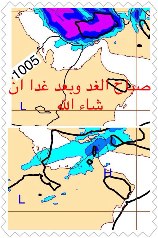 فرص تأثر أجواء شمال السلطنة بحالة من عدم الإستقرار النسبي تتسبب في أمطار متفرقة رعدية أحيانا على مسندم وشمال الباطنة والبريمي غداً بإذن الله