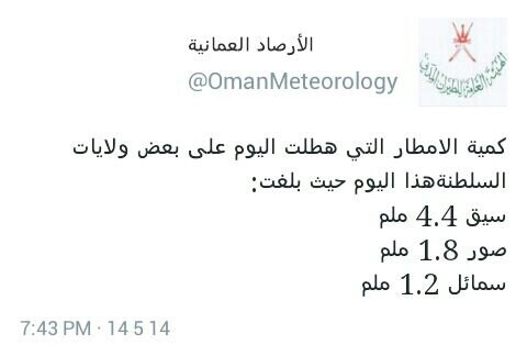 أمطار تراوحت بين الخفيفة والمتوسطة والغزيرة هطلت اليوم على عدد من قرى ولايات بهلاء وسمائل وازكي ونزوى وعبري والمضيبي وابراء ودماء والطائيين وصور أدت الى نزول الشعاب وجريان الاودية/ العمانية