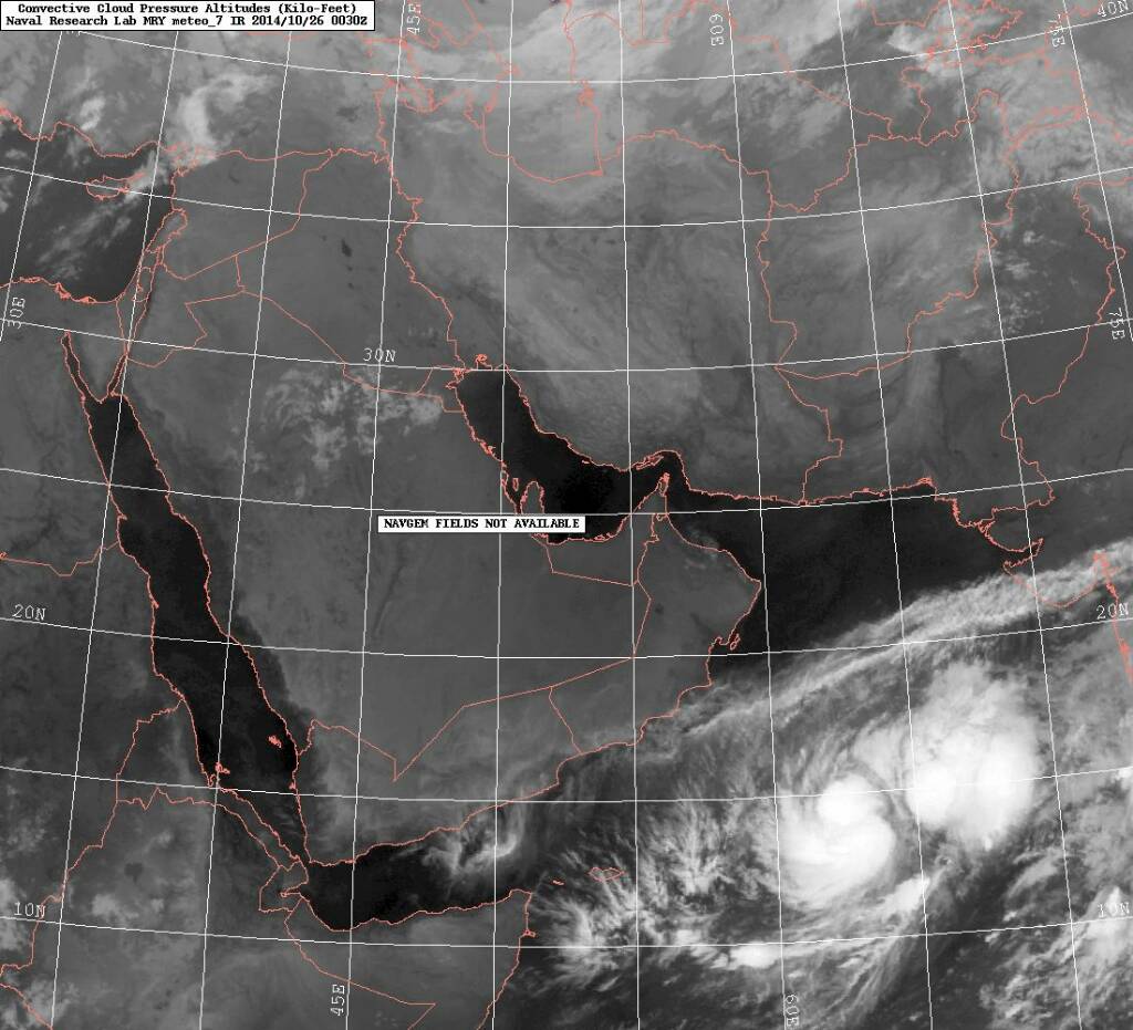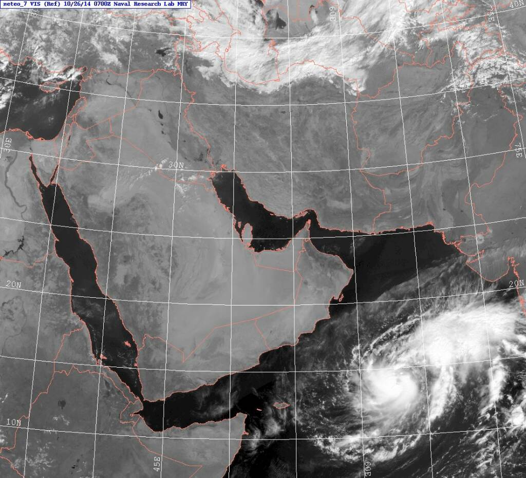The depression over westcentral and adjoining southwest Arabian Sea remained practically stationary and lay centred at 1130 hours IST of today, the 25th October, 2014 near latitude 12.50 N and longitude 61.50 E, about 1400 km west-southwest of Mumbai and 940 km east-southeast of Salalah (Oman). It would move northwestwards towards south Oman and adjoining Yemen coast during next 72 hrs. It would intensify into a deep depression within next 24 hrs and may intensify further into a cyclonic storm during subsequent 24 hrs.
