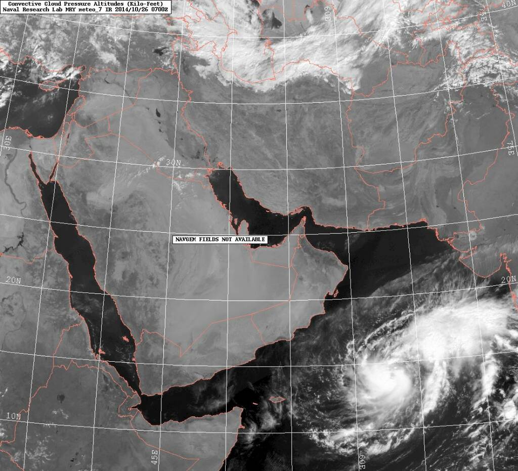العاصفة Nilofar نيلوفار بسرعة 45عقدة وبقيم ضغط 989mb تتحرك لشمال الغربي مقتربة من سواحل السلطنة