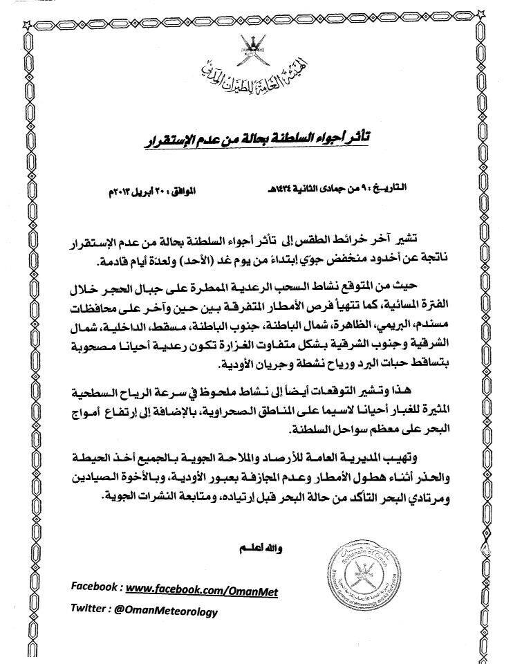 رد: متابعة حالة عدم الاستقرار على السلطنة ودول الخليج العربي ليوم السبت 20 ابريل 2013 والايام القادمة (ج1) ...