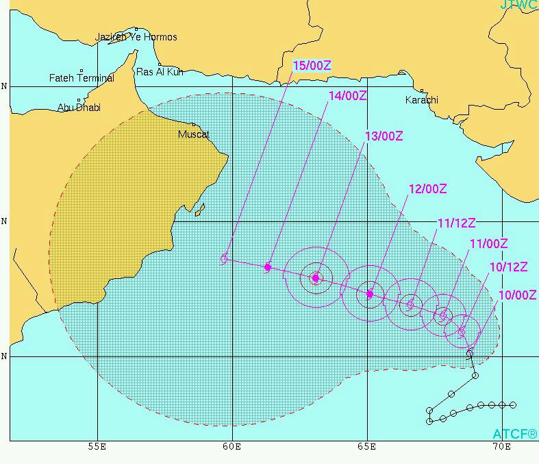 طبعا لا نضع مجال للشك وهو بلوغ العاصفة الى درجة اعصار مداري ( قابل للتطور بنسبة ٦٠٪ ) المسطح المائي يساعد على ذلك حتى مشارف شرق السلطنة ..