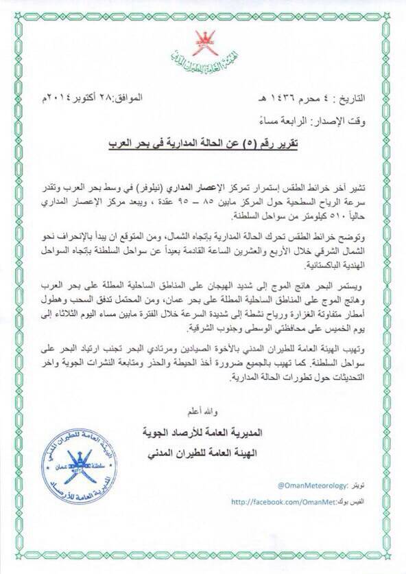 رد: متابعة الإعصار المداري (نيلوفر Nilofar ) في بحر العرب 22/10/2014