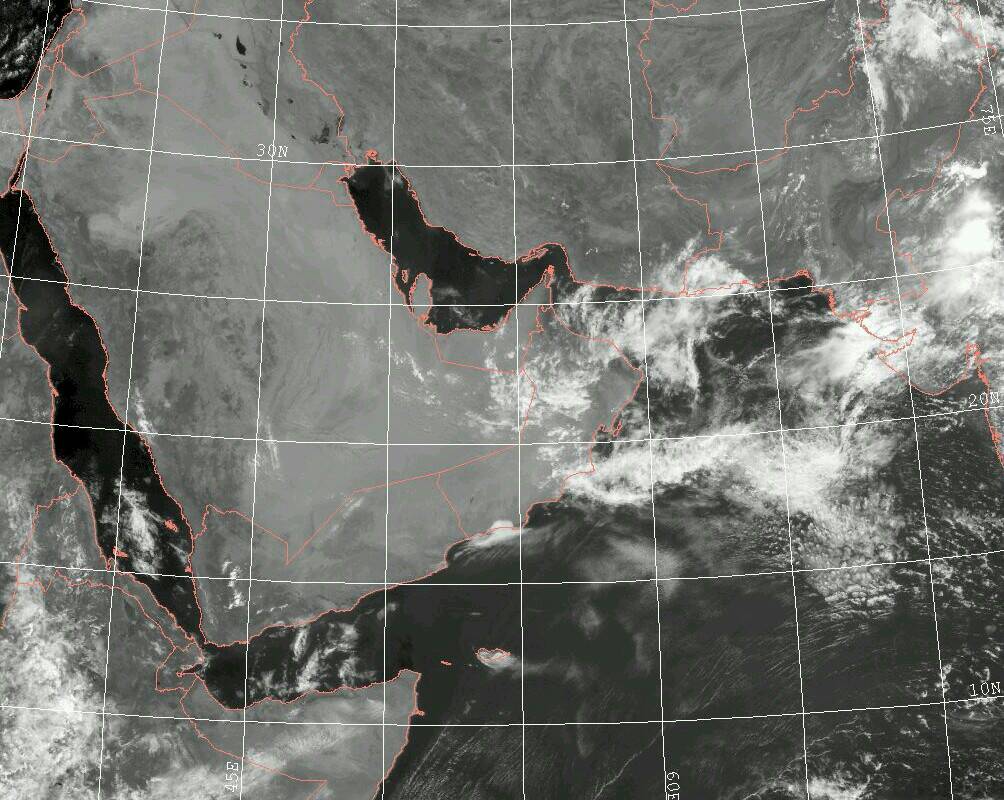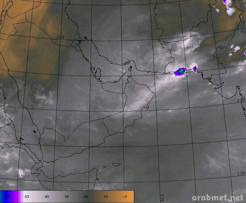 الخلايا الماطرة بغزارة متواجدة على السواحل الباكستانية وإمتداد لسحب المتوسطة والعالية إلى السلطنة مع تساقط الرذاذ وأمطار خفيفة في بعض الأحيان