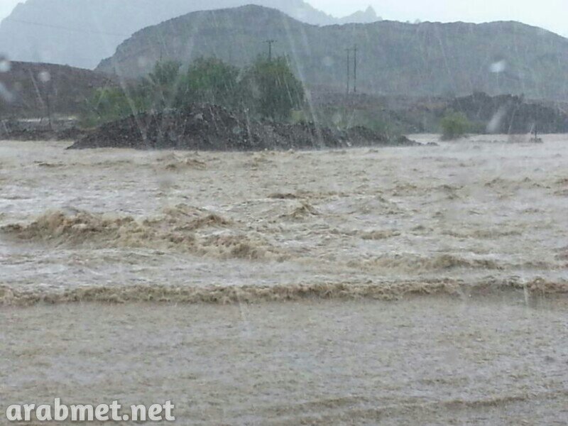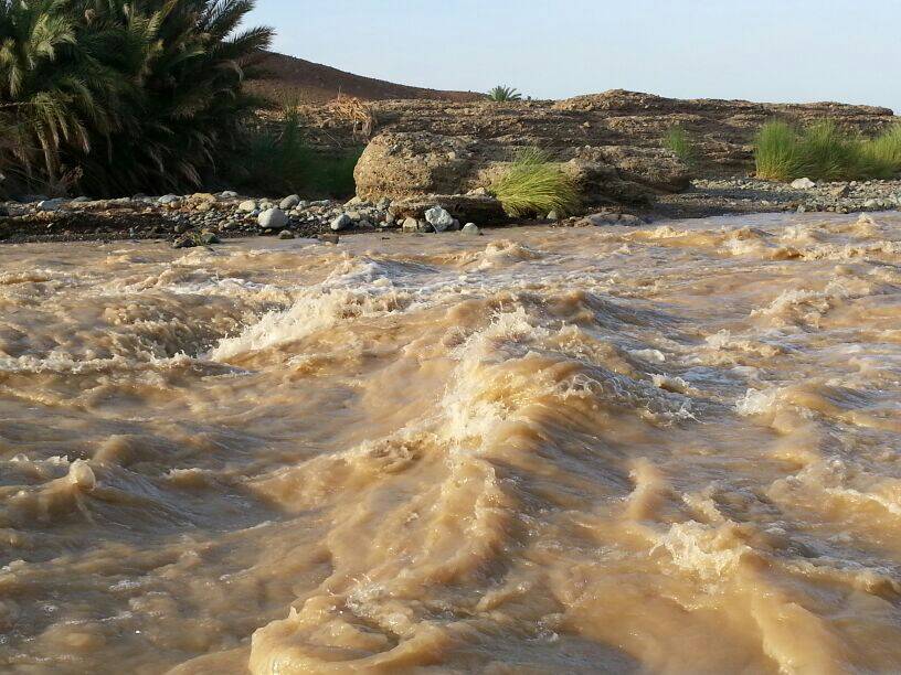 شاهد وادي السحتن يعبر مركز المدينة بعد أن فيضانه من من السد وعبور مسافة تزيد عن 35 كم