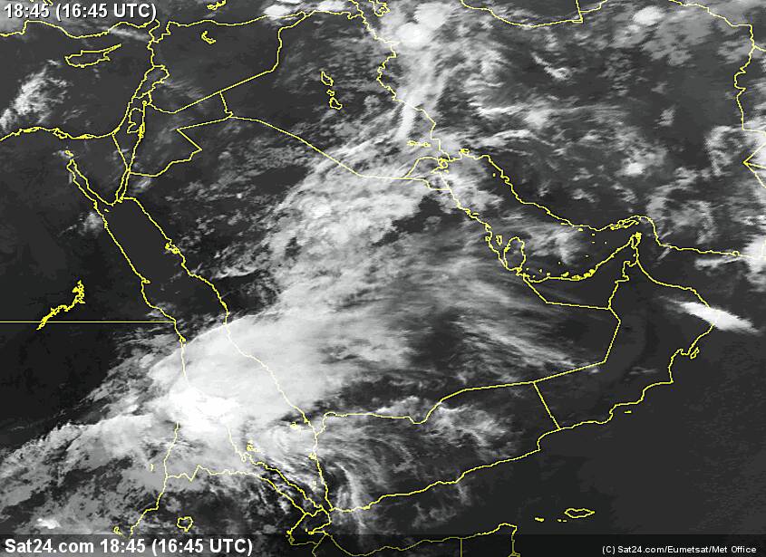 الصورة الجوية توضح الخلايا الرعدية التي تأثر حاليا بأمطار رعدية على جبال الحجر والمناطق القريبة
