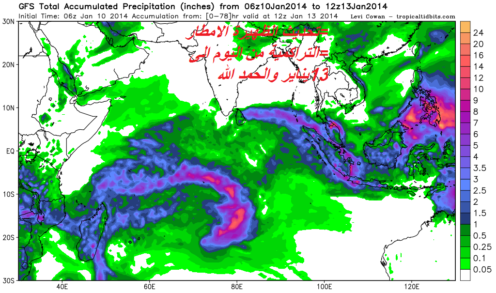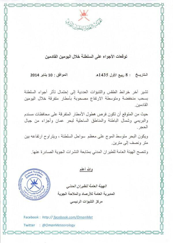 تأثير الحالة يبداء من مساء اليوم على مسندم يمتد بعد ذلك الى بقية المناطق الامطار متفاوته في الغزاره..الحذر في حال جريان الاوديه و خصوصا على الدواخل جهة الحجر الغربي ...امطار خير و بركه