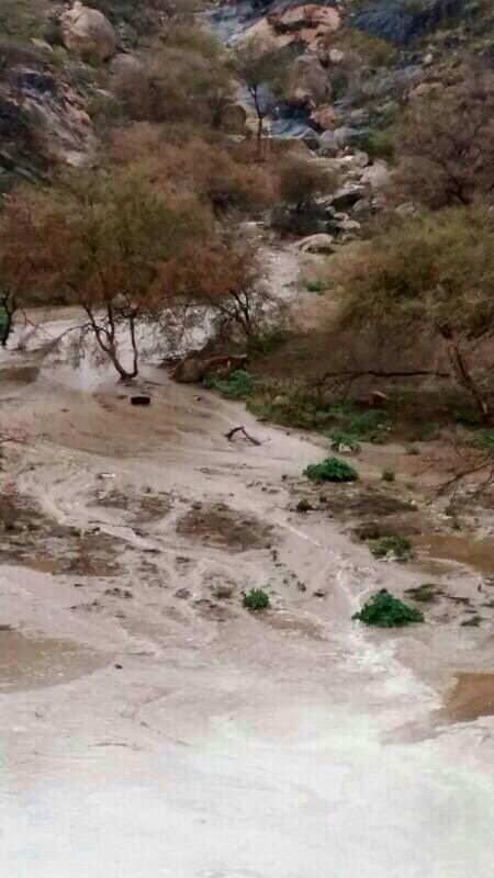مصحوبة بالبرق والرعد وقد تركزت شدة الأمطار على رؤوس الجبال والمناطق المجاورة وادت إلى جريان بعض الأودية والشعاب.