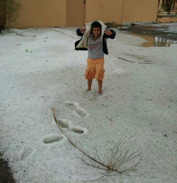 فرحة طفل بعد تساقط البرد بالمصنعة