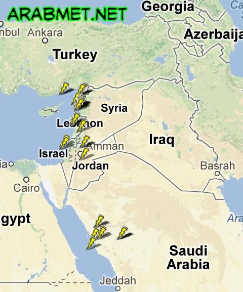 بداية نشاط رعدي ببلاد الشام حسب رصد البروق #فلسطين #الأردن #سوريا #لبنان وآخر ب #السعودية شمال المدينة المنوره