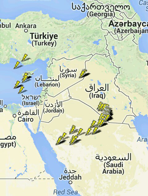 إنتشار البروق على أجزاء من السعودية والعراق وسوريا والبحر المتوسط