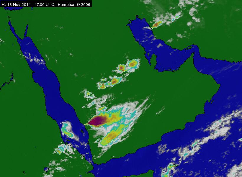سحب ركامية ماطرة بمرتفعات اليمن ووسط وجنوب السعودية وأجزاء من الخليج العربي