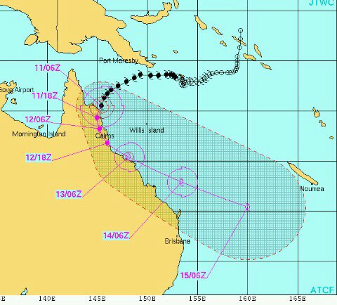 صورة توضح مسار الإعصار إيتا وقد ضرب الأراضي الاسترالية شمال كوينزلاند ويتوقع إنحرافه لاحقا لشمال الشرقي