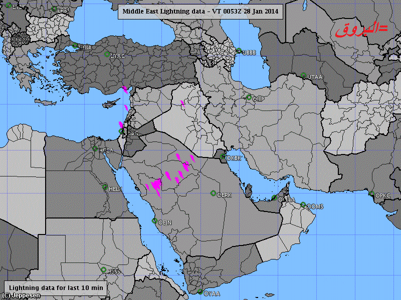 البروق منتشرة في المملكة واشارة برق ف العراق وبروق كثيفة تقترب من سواحل لبنان وفلسطين