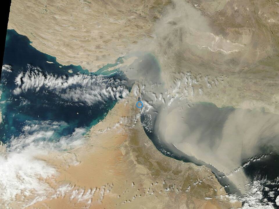 صورة طبيعية عالية الوضوح تظهر تواجد الغبار على بحر عمان وبداية تأثيره على بعض سواحل السلطنة