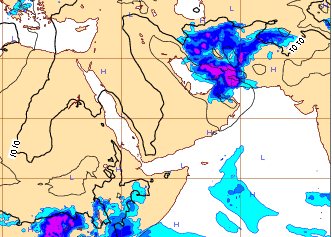 اللون الاحمر يدل على الامطار / اللون الابيض يدل على السحب ونلاحظ اجواء غائمه على معظم شمال عمان وصولاً للوسطى