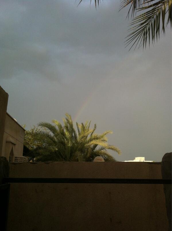 الشمس سطعت من جهة الشمال الغربي مع استمرار الامطار الخفيفة .. ادت الى ظهور قوس الرحمن وفي منظر رائع جهة البحر .. الرياح الحالية هي جنوبية .,