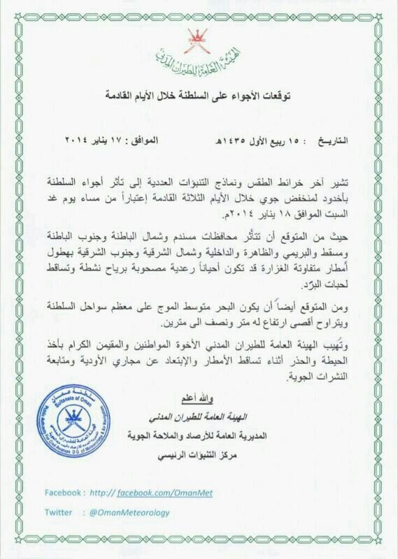 لا تزال التنبؤات تشير الى احتمال تاثر محافظات شمال السلطنة بمنخفض جوي عميق ولله الحمد