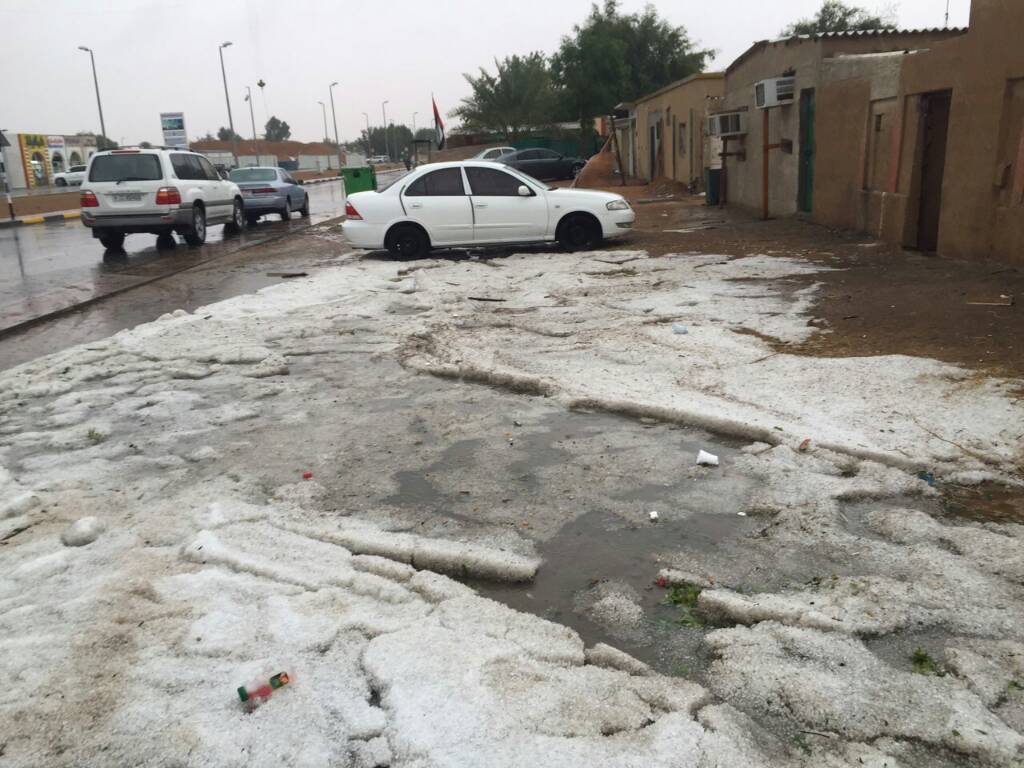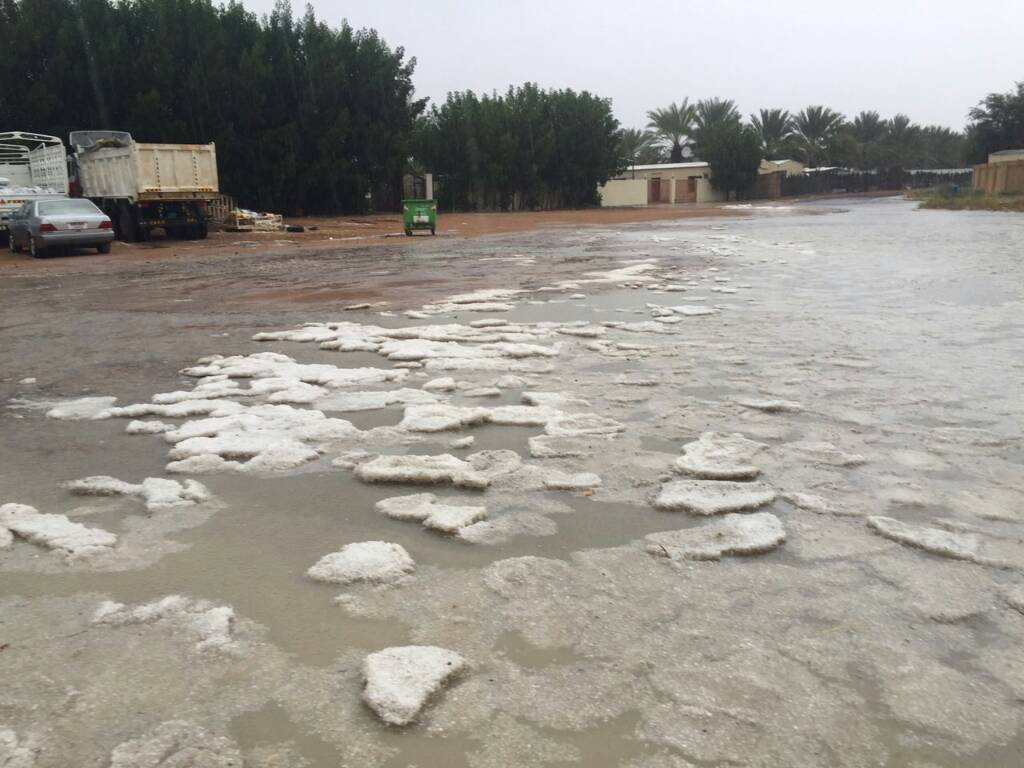 كميات البرد كبيرة في الهير وجريان الشوارع من البرد الحمد لله على هذا الخير