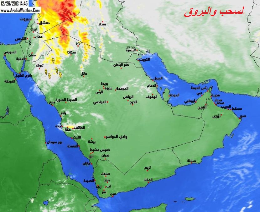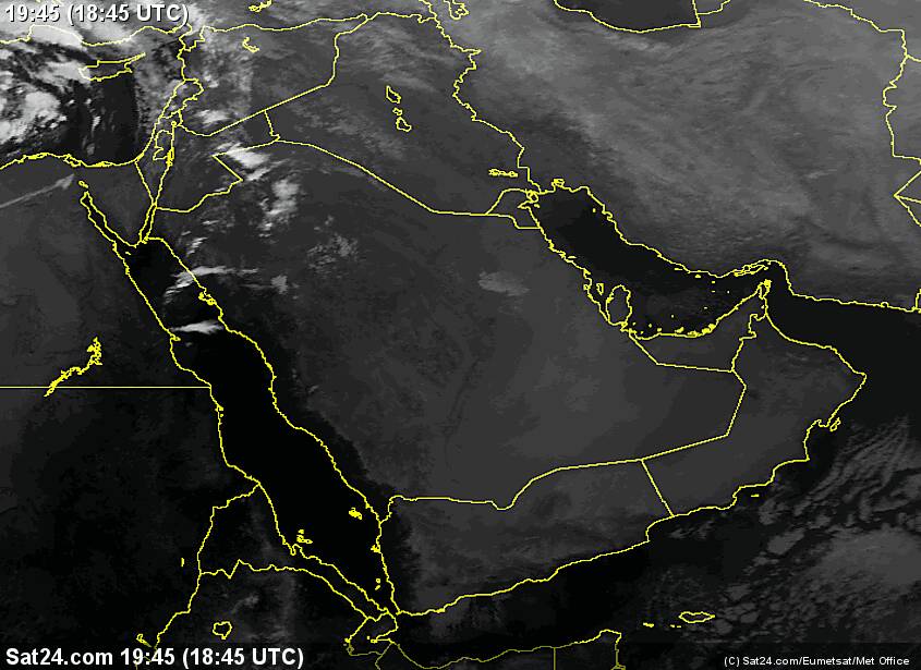 الأقمار توضح تأثير السحب الركامية الماطرة على بلاد الشام والعراق والسعودية كما تظهر بعض السحب المنخفضه على سواحل بحر عمان وسواحل الإمارات
