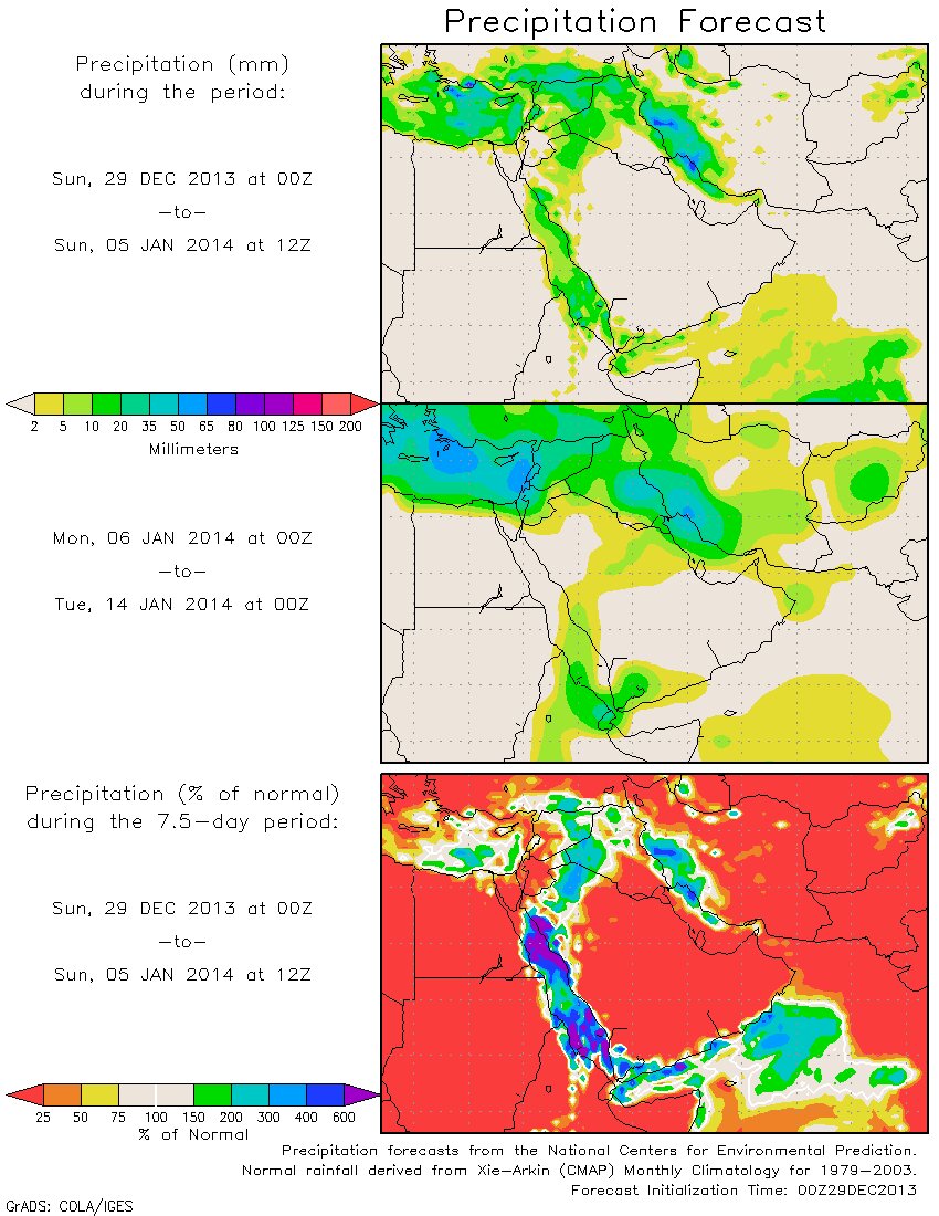 توضح الخرائط تقدم منخفض جوي متمركز حاليا على البحر المتوسط يبداء تأثيره من اليوم وخلال الثلاث أيام القادمة على بلاد الشام والعرق وأجزاء من السعودية ثم يصل تأثيره لاحقا للأراضي الإيرانية