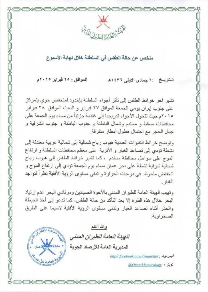 رد: متابعة : أحوال الطقس في السلطنة والخليج العربي خلال شهر فبرايـــر 2015م